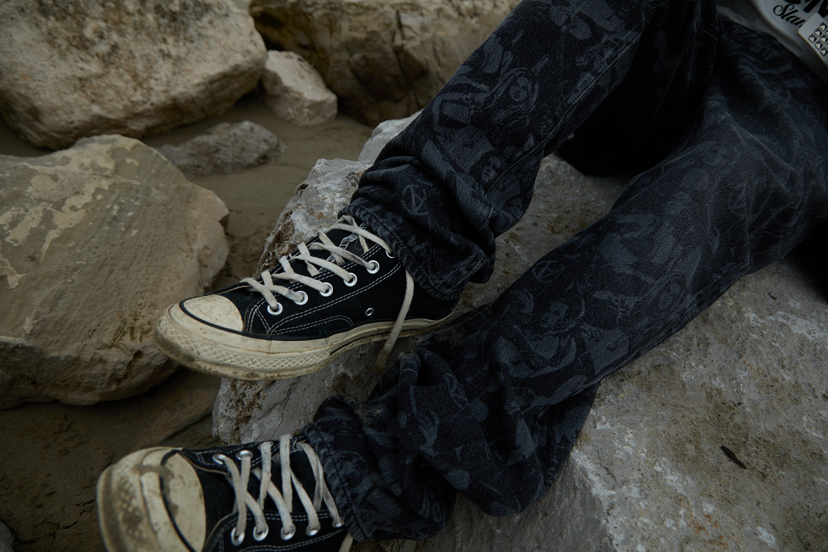 If one were to rifle through the clothes, stylized women would stare right back: covered in punk attire and pins stamped with Slam Jam’s initials, carrying guns while wearing leather jackets. Their portraits are laser-etched across a pair of jeans or printed boldly on shirts and hoodies. These pieces carry graphic nods to retro flyers and fanzines, an homage to the DIY visual grammar that once defined the underground.
