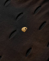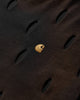 Slam Jam and Carhartt WIP, longstanding friends and partners, join forces to reimagine core pieces that are dirty and cut. Working closely with Tintoria Emiliana, heritage techniques meet experimental takes in the clothes’ dying and cutting process. The iconic brown is overdyed in black, revealing its true colors through wear. Laser cuts make for a repetitive tear motif across the garments, while logos emerge through faded textiles as rough, black screenprints — ghostlike, almost worn into the fabric.
