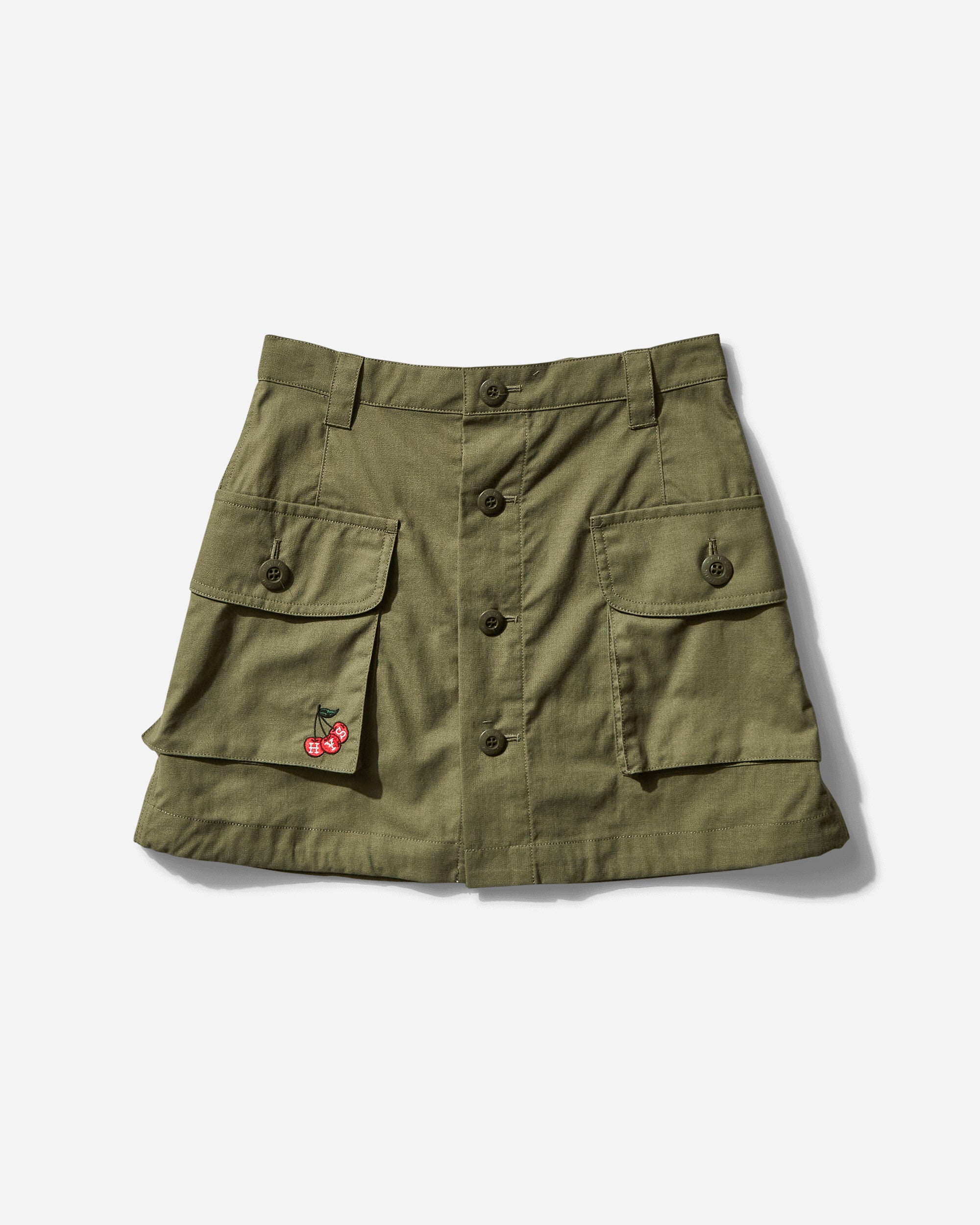 This skirt takes inspiration from men's vintage military jacket. The string at the hem can be tightened to transform it into a balloon shape, so you can style it by itself or layering it with pants and the material used is a reproduction of a vintage military jacket.